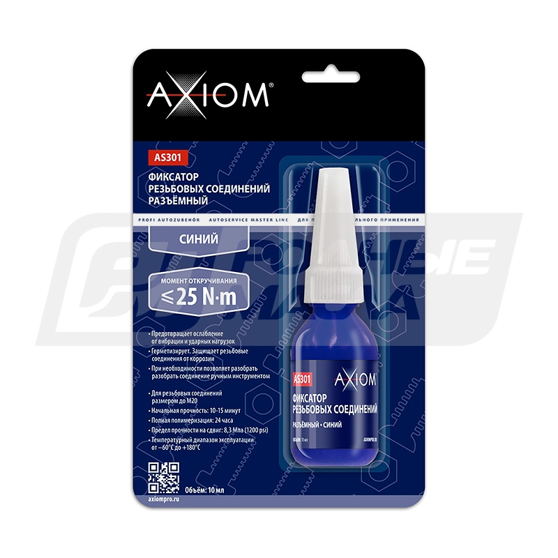 Предотвращает коррозию резьбы. Фиксатор резьбы AXIOM® AS301 полимеризуется без доступа воздуха в зазорах до 0,13 мм. Температурный диапазон эксплуатации отвержденного фиксатора от –60°C до +180°C. Момент откручивания на незатянутой резьбовой паре не более 25 Н·м. Предел прочности на сдвиг – 8,3 МПа (1200 psi). Предназначен для крепежных элементов размером до М20.